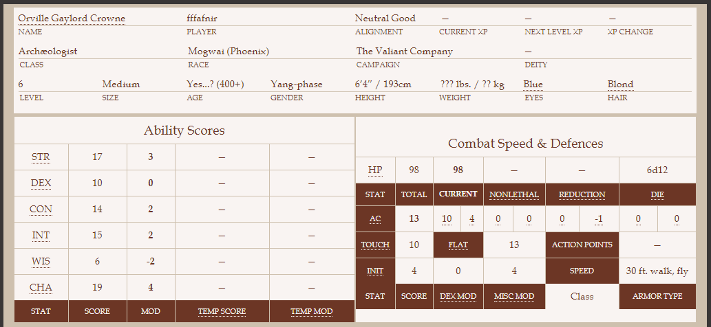 This is a fully HTML DnD 3.5e sheet, made with long-distance games particularly in mind. Using inline CSS, this sheet was specifically made for CSS-restrictive web hosts such as toyhou.se, where non-inline CSS is a paid feature. Features all basic 3.5e sheet fields; responsive elements that look the same on every display; find-and-replace friendly accent, background, and text colors; and beginner-to-HTML-friendly commented sections to indicate where to replace data.