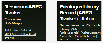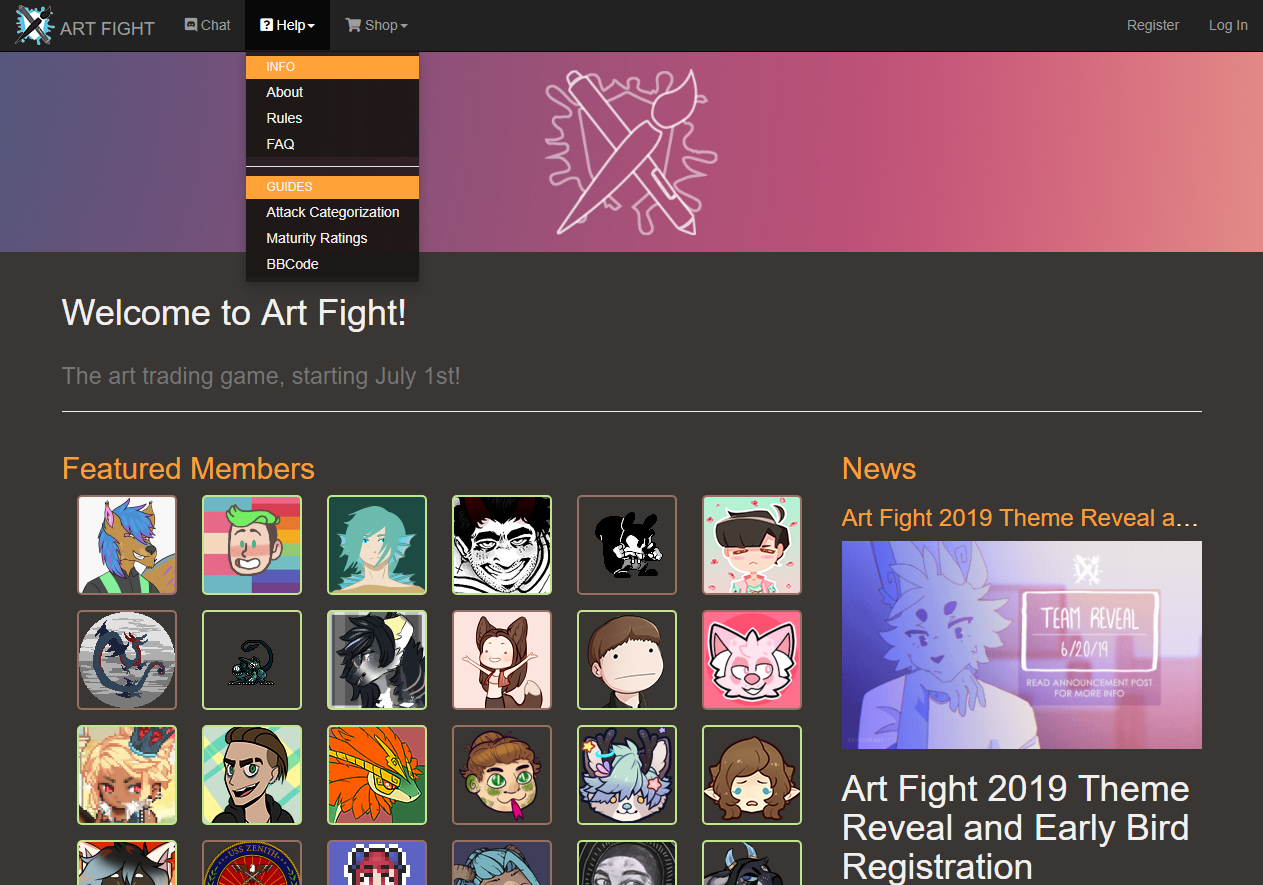 A simple theme whipped up in a few days’ time to darken most surfaces on Art Fight dot Net. In addition to the dark background with light hyperlinks, panels are made a translucent black, borders are made solid until hovered over, and hyperlink transitions have a smooth delay. This applies to all pages on the domain.